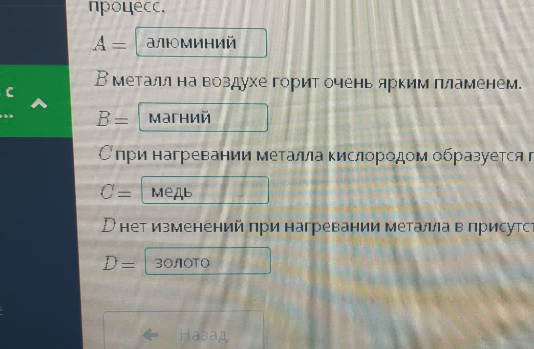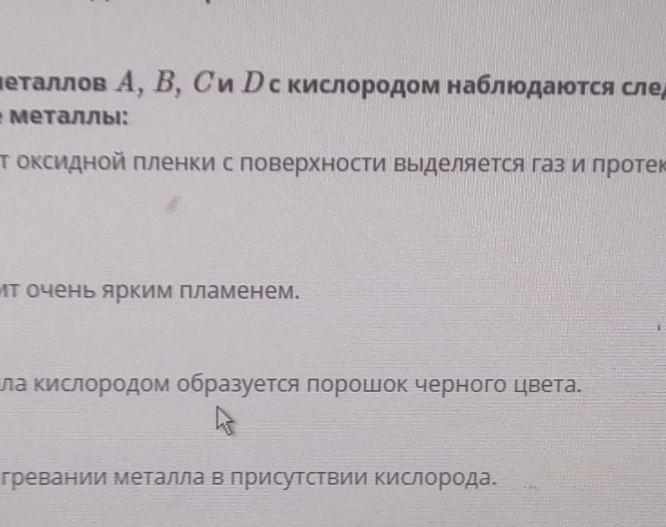 При взаимодействии металлов A, B, C и D с кислородом наблюдаются следующие изменения. Определи неизвестные металлы