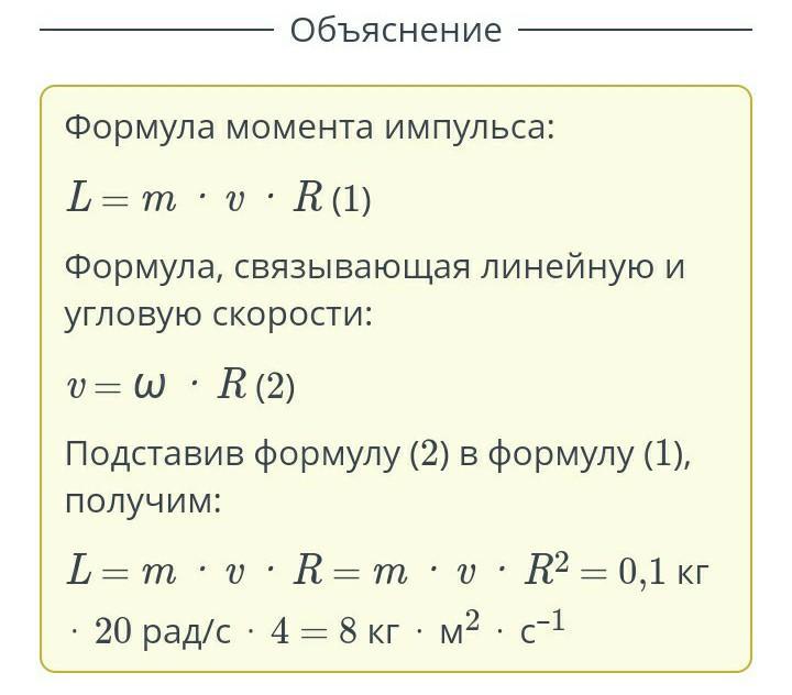 Тело массой 100 г движется по окружности радиусом 2 м с угловой скоростью 20 рад/с. Чему равен момент импульса тела?