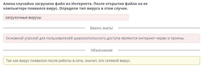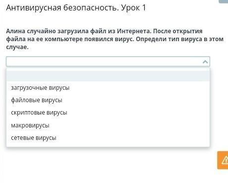Алина случайно загрузила файл из Интернета. После открытия файла на ее компьютере появился вирус. Определи тип вируса в этом случае.