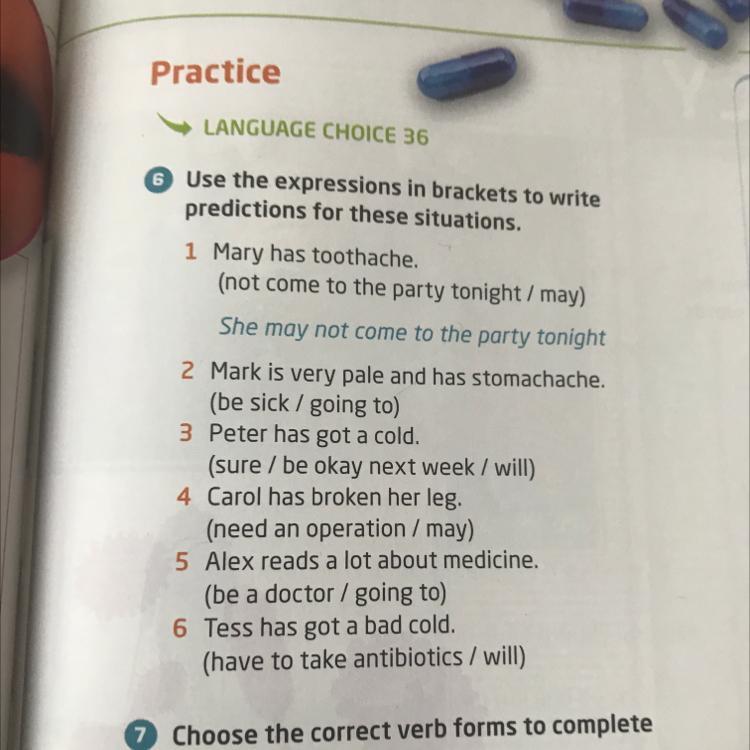 2. He going to be sick. 3. He will be okay next week sure. 4. She may need an operation. 5. He going to be a doctor. 6. She will have to take antibiotics.