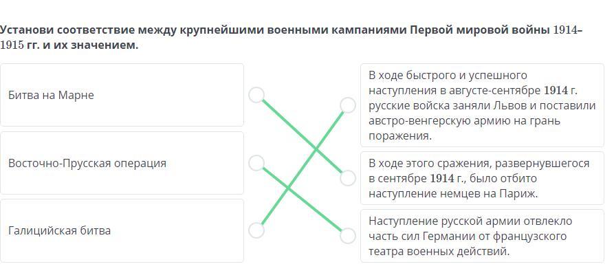 Установи соответствие между крупнейшими военными кампаниями Первой мировой войны 1914–1915 гг. и их значением.