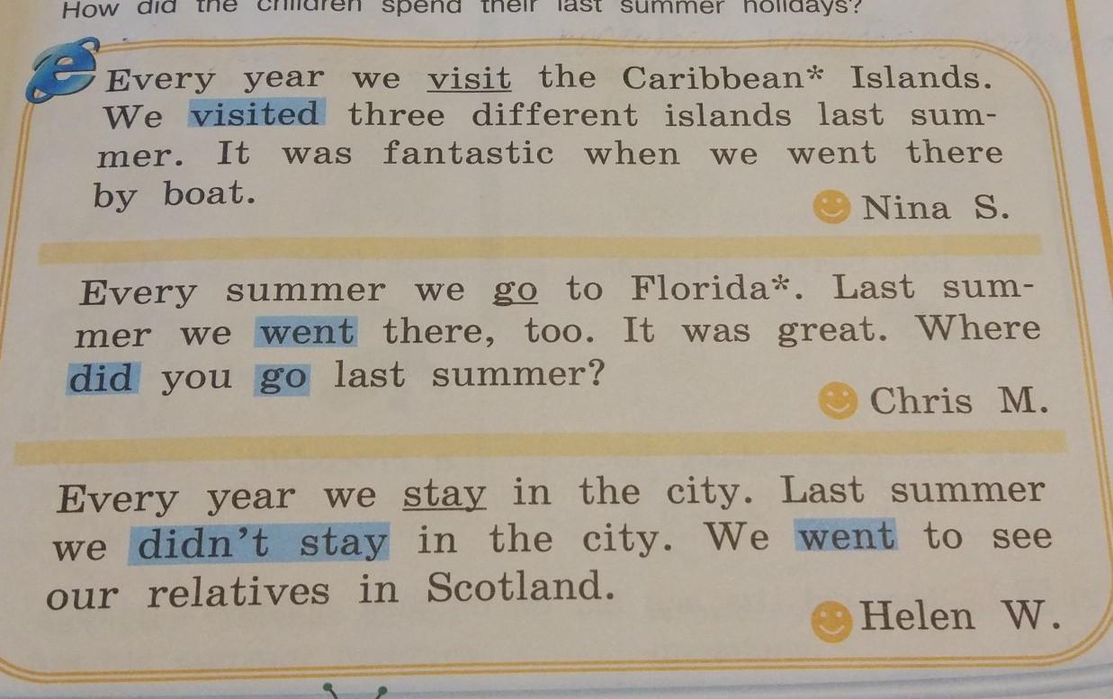 каждый год мы посещаем Карибские острова. Прошлым летом мы посетили три разных острова. Это было фантастически, когда мы отправились туда на лодке. Каждое лето мы едем во Флориду. Прошлым летом мы тоже туда хотим. Это было здорово. Где вы были прошлым летом? Каждый год мы остаемся в городе. Прошлым летом мы не остались в городе. Мы поехали к родственникам в Шотландию.
