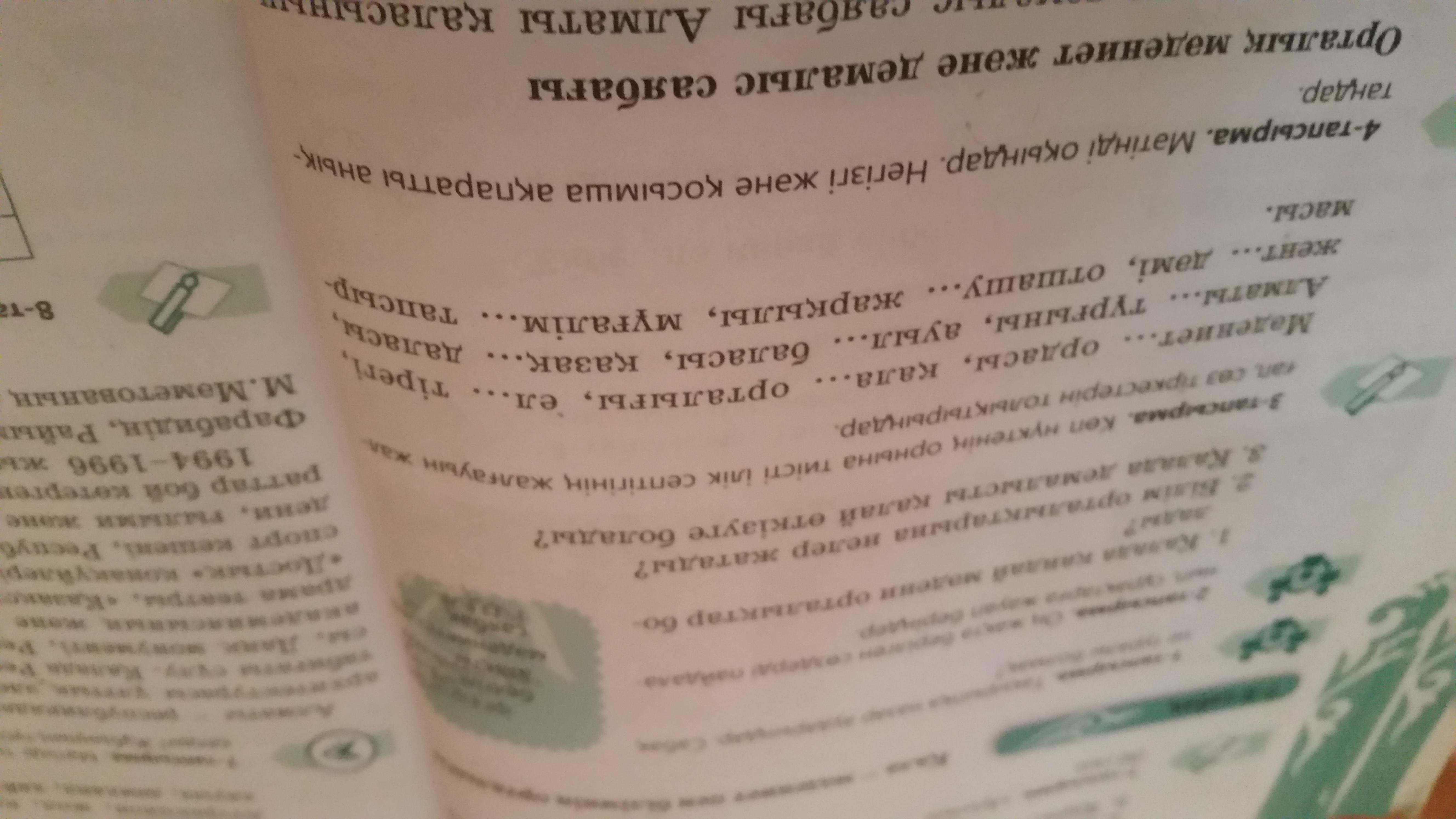 Мәдениеттің ортасы, қаланың орталығы, елдің тірегі, Алматының тұрғыны, ауылдың баласы, қазақтың даласы, женттің дәмі, отшашудың жарқылы, мұғалімнің тапсырмасы.