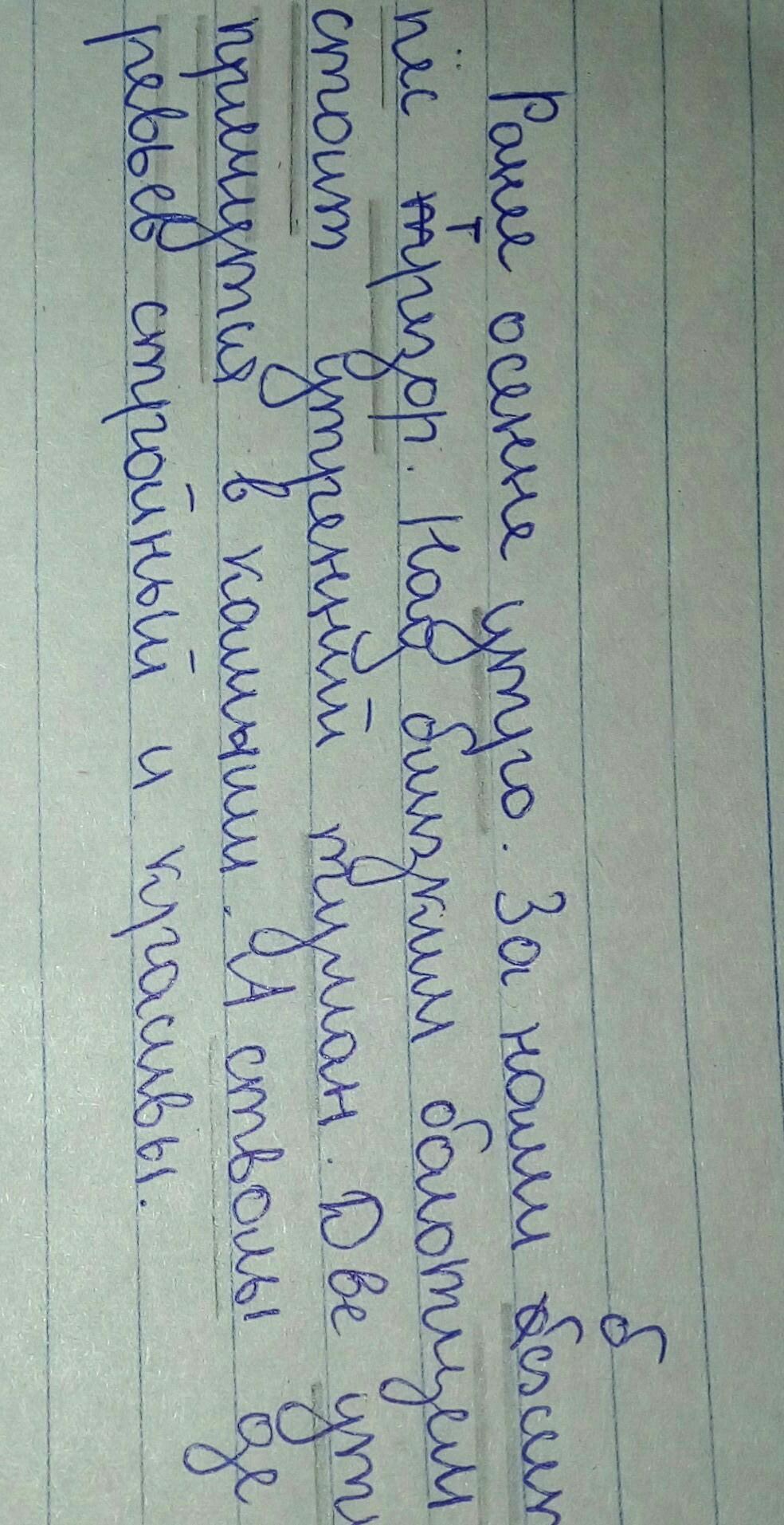 Раннее осеннее утро. За нами бежит пес Трезор. Над близким болотцем стоит утренний туман. Две утки прячутся в камыши. А стволы деревьев стройны и красивы. Подчеркнуть главные члены предложения.