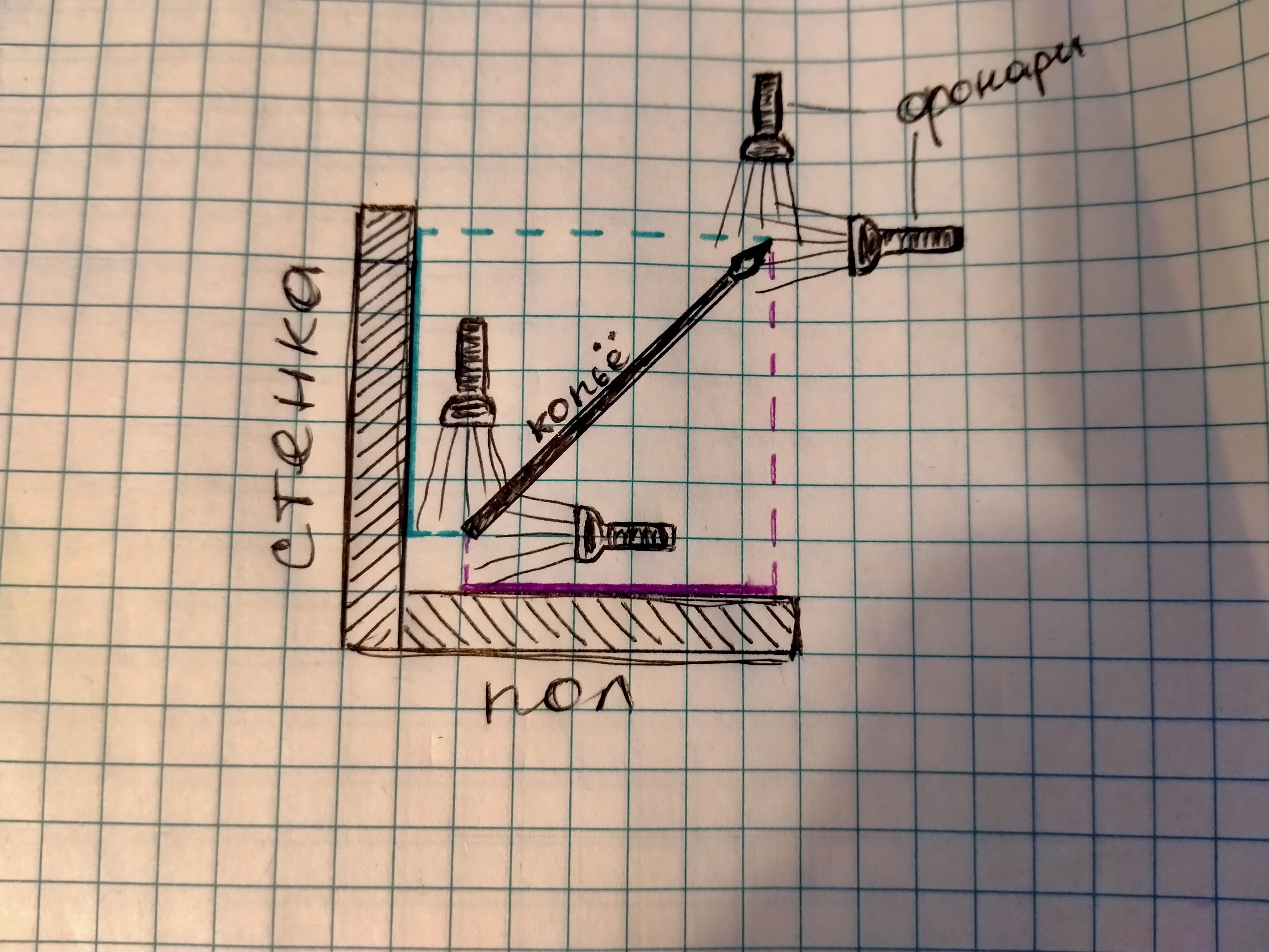 Зачем косинусы и синусы? Чтобы найти длину тени на полу (косинус) и длину тени на стенке (синус). Если говорить геометрически, то длина тени на полу - прилежащий катет к гипотенузе (то есть, к копью, на концы которого светят фонари сверху), а чтобы найти длину этого катета, надо гипотенузу умножить на косинус угла между гипотенузой и этим катетом. Та же история и с тенью на стене. Только эта тень - противолежащий катет, поэтому здесь гипотенузу надо умножать на синус того же угла, что и косинус.