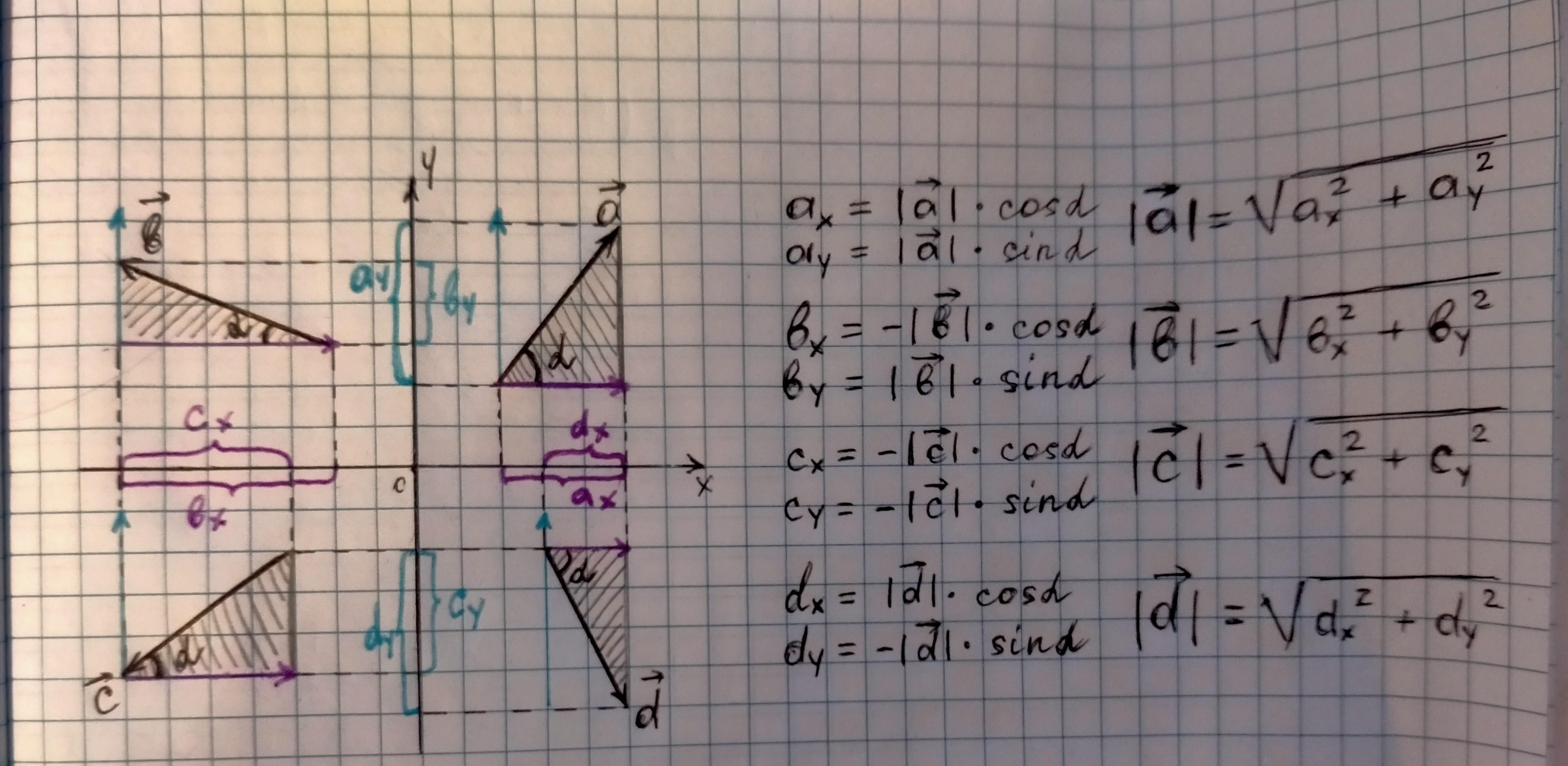 Крайние формулы справа на рисунке - это когда известны проекции, а величина вектора неизвестна. Здесь банальная теорема Пифагора идёт в ход. Если попрактиковаться немного, то будешь на раз находить проекции)