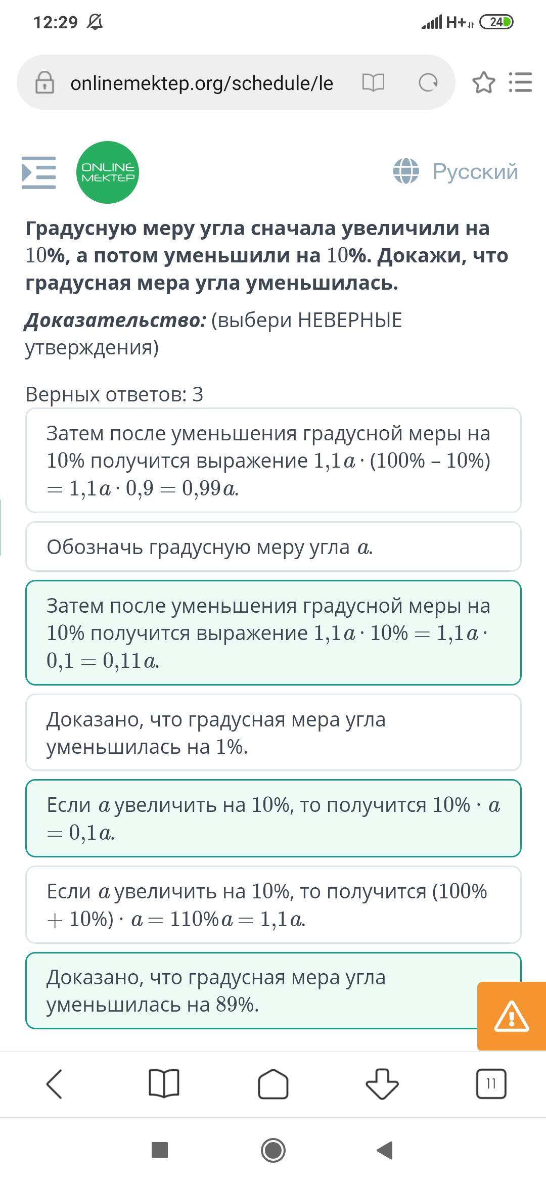 Градусную меру угла сначала увеличили на 10%, а потом уменьшили на 10%. Докажи, что градусная мера угла уменьшилась. Доказательство: (выбери НЕВЕРНЫЕ утверждения) Верных ответов: 3 Доказано, что градусная мера угла уменьшилась на 89%. Обозначь градусную меру угла a. Затем после уменьшения градусной меры на 10% получится выражение 1,1a · (100% – 10%) = 1,1a · 0,9 = 0,99a. Если a увеличить на 10%, то получится 10% · a = 0,1a. Доказано, что градусная мера угла уменьшилась на 1%. Затем после уменьшения градусной меры на 10% получится выражение 1,1a · 10% = 1,1a · 0,1 = 0,11a. Если a увеличить на 10%, то получится (100% + 10%) · a = 110%a = 1,1a.