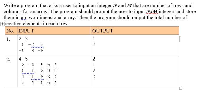 Напишите программу, которая просит пользователя ввести целое число N и M, которые являются количеством строк и столбцов для массива. Программа должна предложить пользователю ввести NxM целых чисел и хранить их в двумерном массиве. Затем программа должна вывести общее количество отрицательных элементов в каждой строке.
