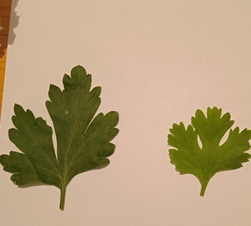 По цвету и размеру + у петрушки более заострённые кончики