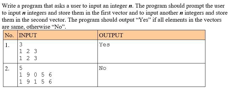 Напишите программу, которая просит пользователя ввести целое число n. программа должна предложить пользователю ввести n целых чисел и сохранить их в первом векторе, а также ввести еще n целых чисел и сохранить их во втором векторе. Программа должна вывести “Да”, если все элементы в векторах одинаковы, в противном случае “нет”.
