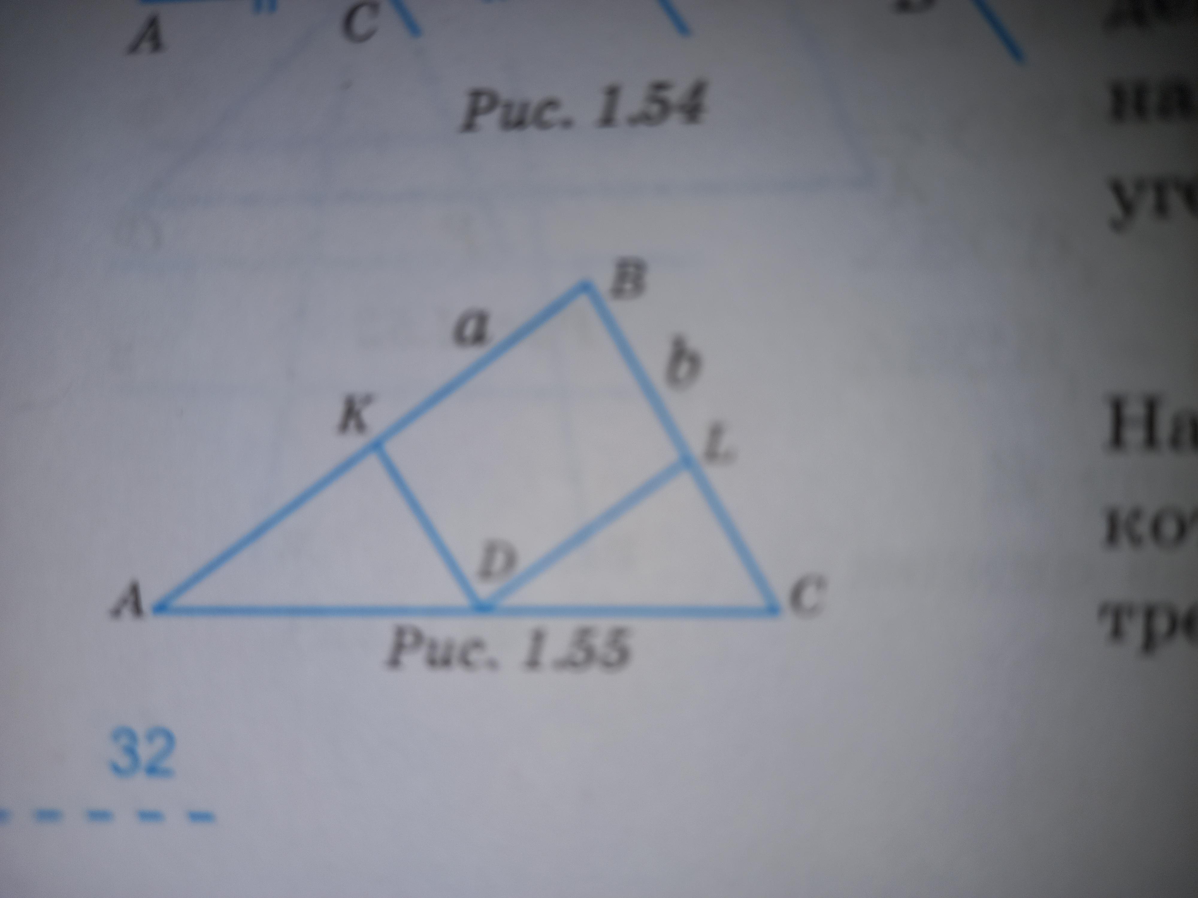 Две стороны треугольника равны a и b.Через середину третьей стороны проведены прямые параллельные данным сторонам.Найдите периметр полученного четырухугольника.(рис. 1.55).