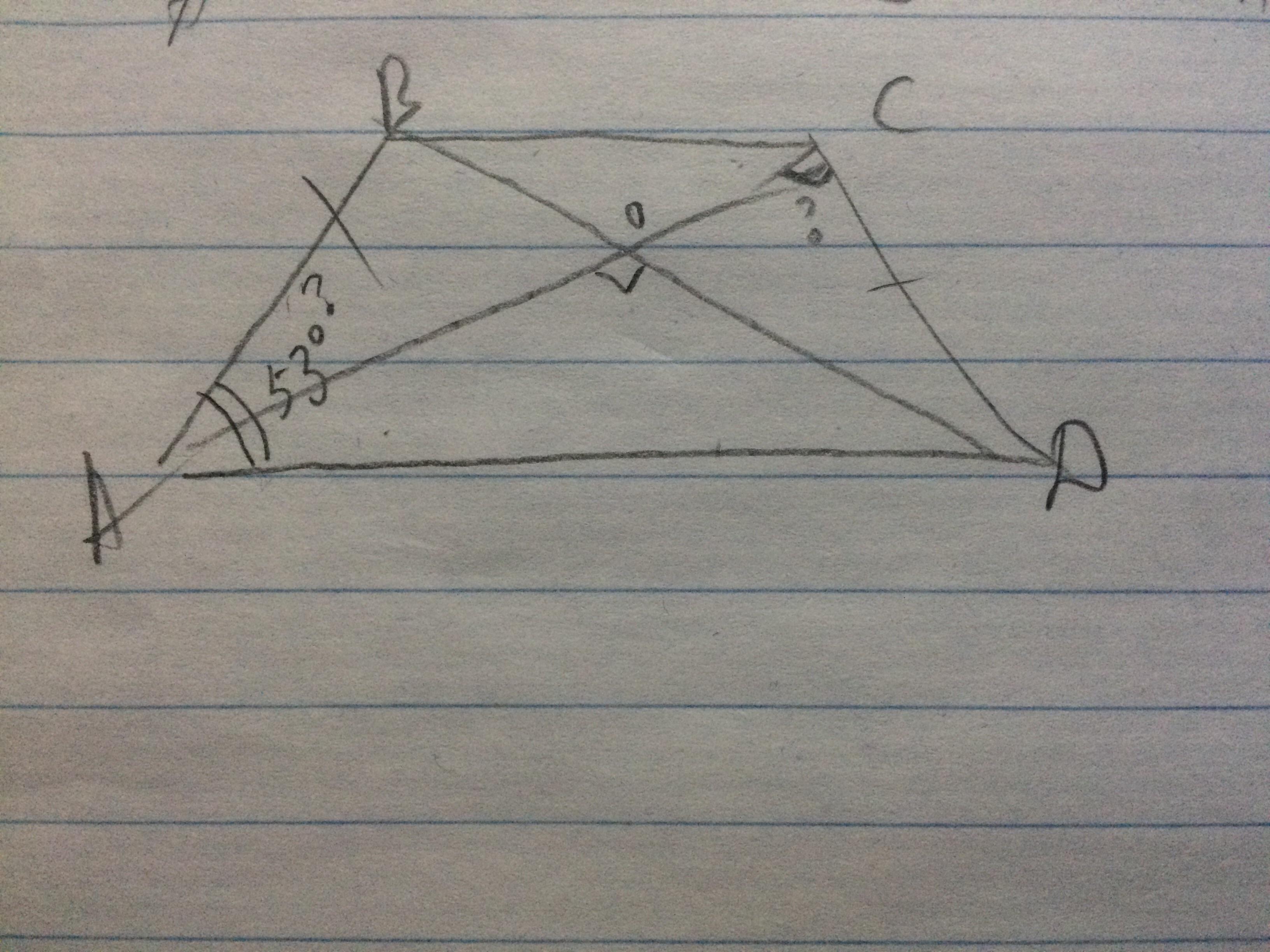 Диагонали равнобедренной трапеции перпендикулярны. Найдите угол между диагональю и боковой стороной трапеции, если её острый угол равен 53