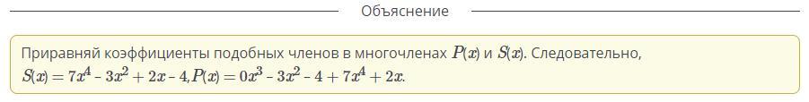 Многочлены P(x) и S(x) равны. Найди коэффициенты переменных и заполни пропуски. S(x) = x4 – 3x2 + x – P(x) = x3 – x2 – 4 + 7x4 + 2x
