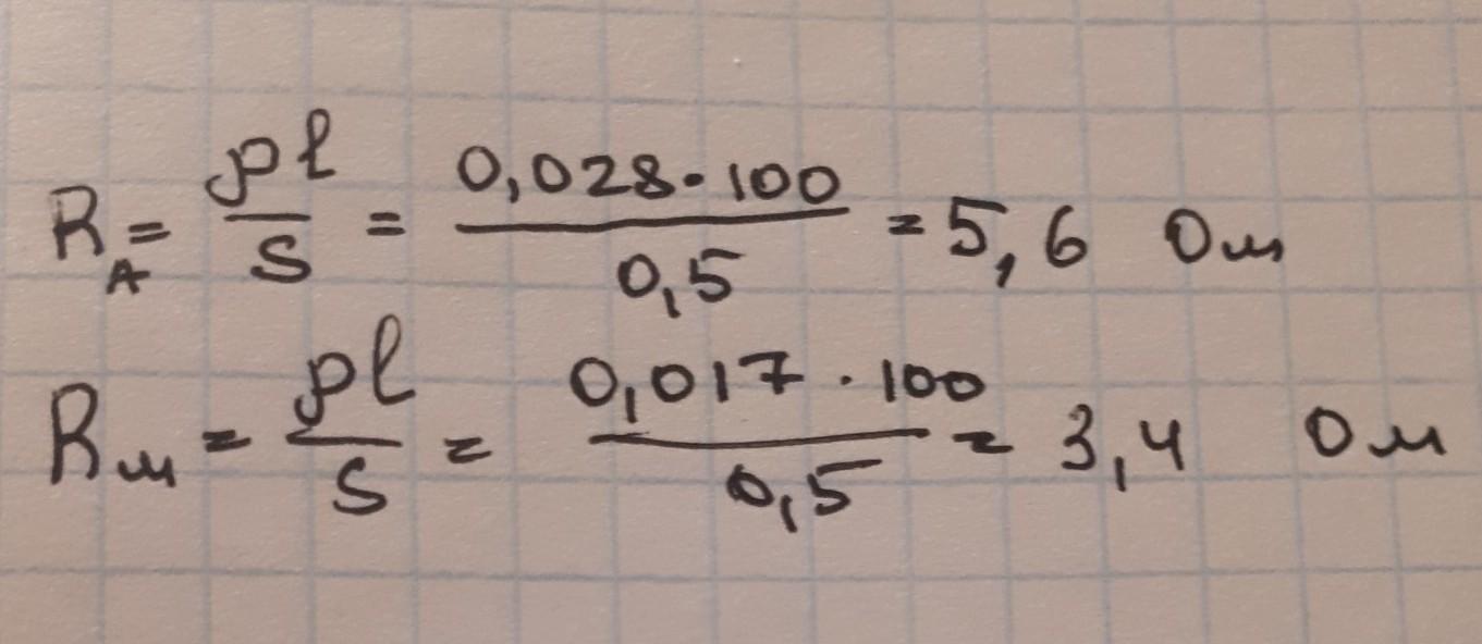 Чему равно сопротивление алюминиевой и медной проволоки длиной 100 м и площадью поперечного сечения 0,5 мм в квадрате