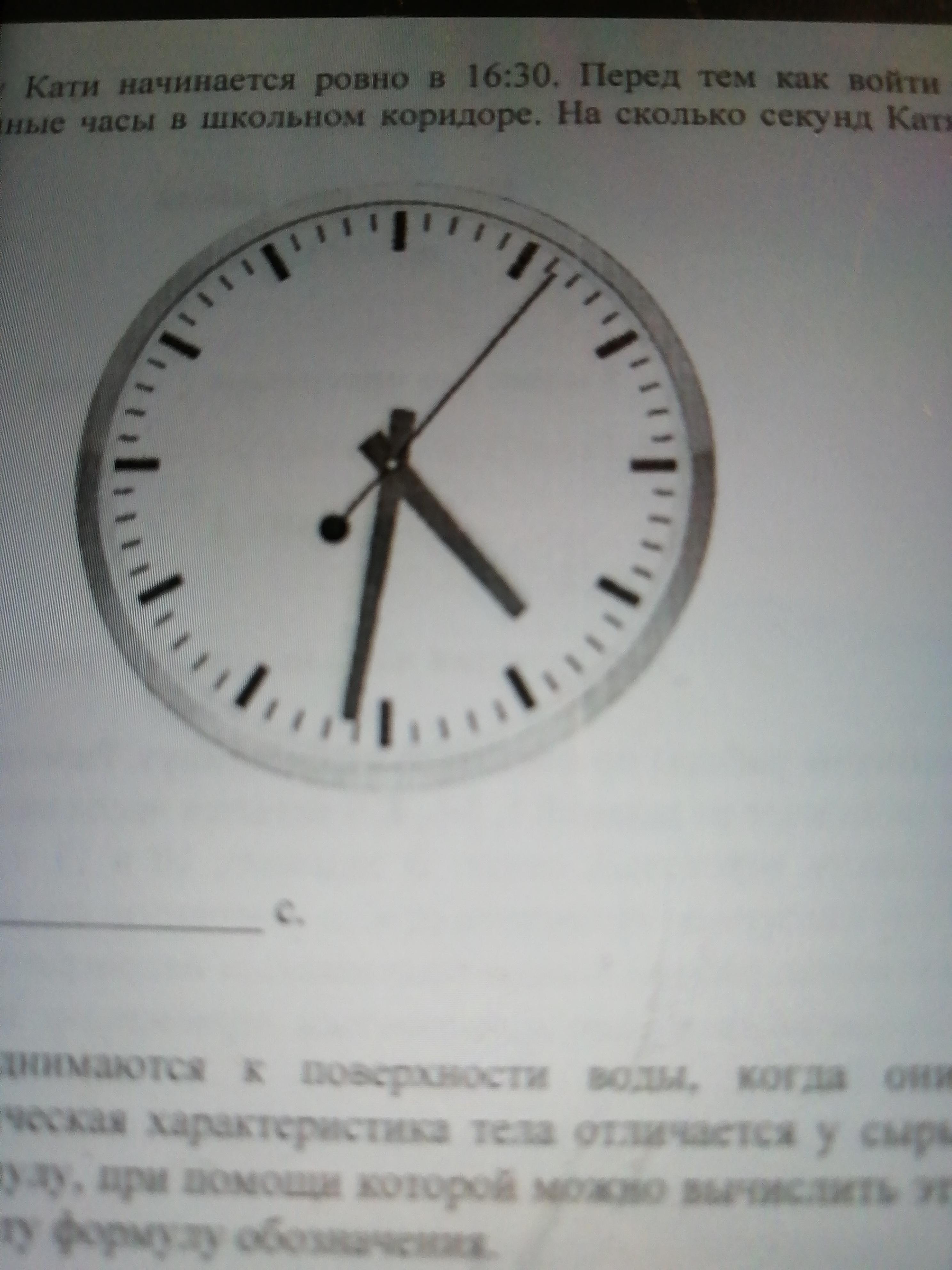 Кружок по физике у кати начинается ровно в 16:30. Перед тем как войти в класс, она посмотрела на настенные часы в школьном коридоре. На сколько секунд катя опоздала на занятия?