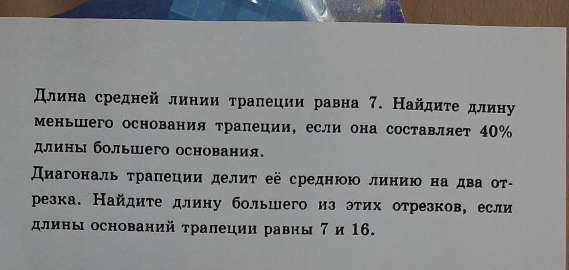 2) Диагональ трапеции делит ее на два треугольника. Следовательно треугольник с бо́льшим основанием трапеции имеет бо́льшую среднюю линию