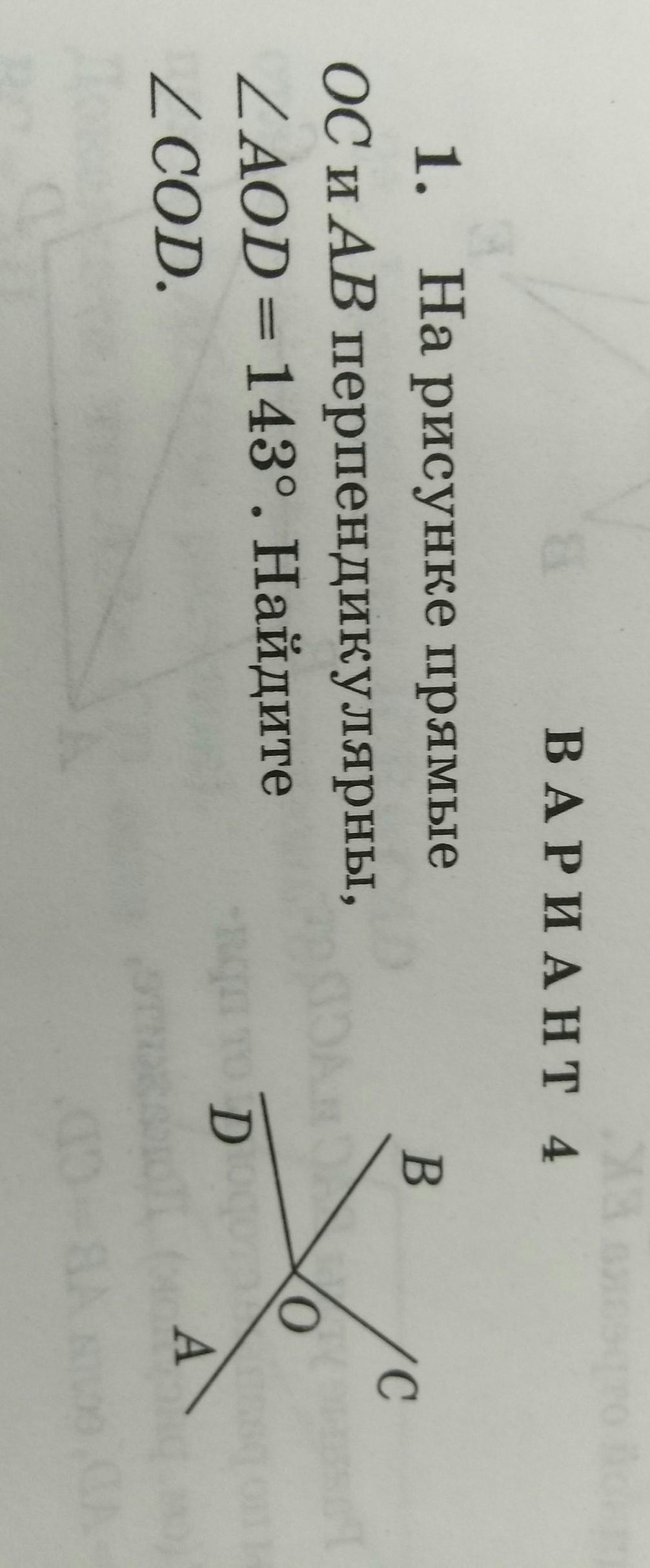 На рисунке прямые oс и ab перпендикулярны. AOD = 143* (градуса) Найдите угол COD