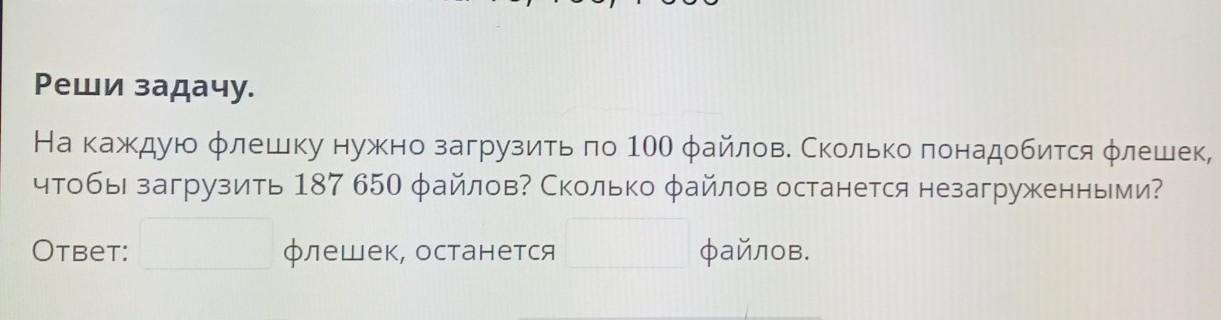 Ответ: понадобится 1876 флешек; останется 50 файлов.
