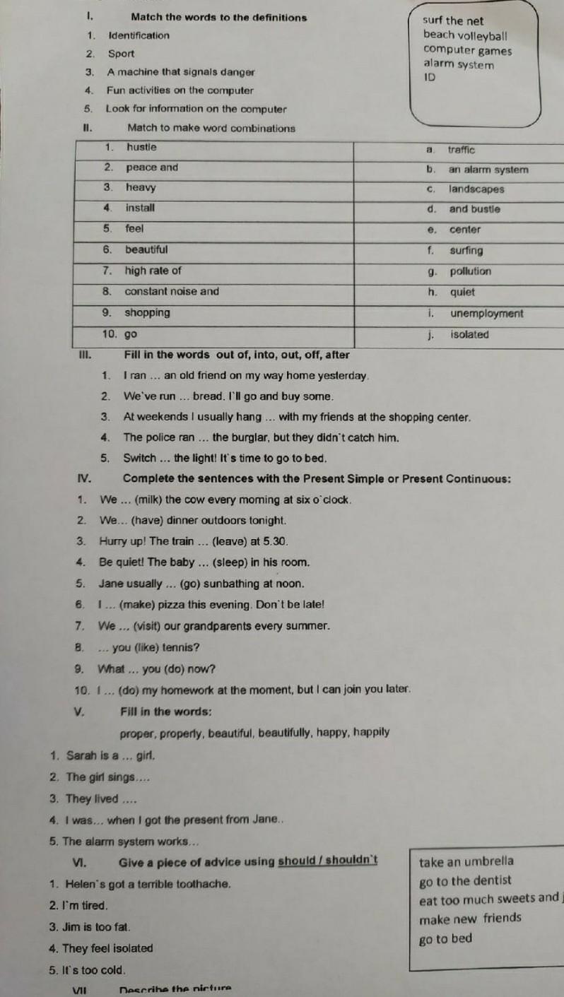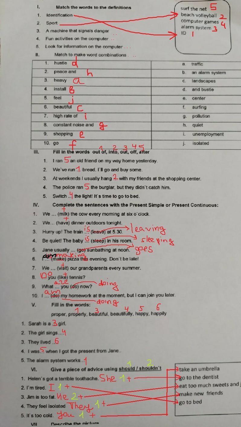 1 - into; 2 - out of; 3 - out; 4 - after; 5 - off