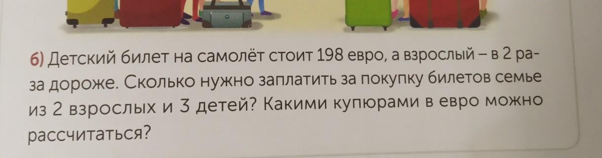 1) 198 * 2 = 396 (евро) - стоимость взрослого билета на самолёт.