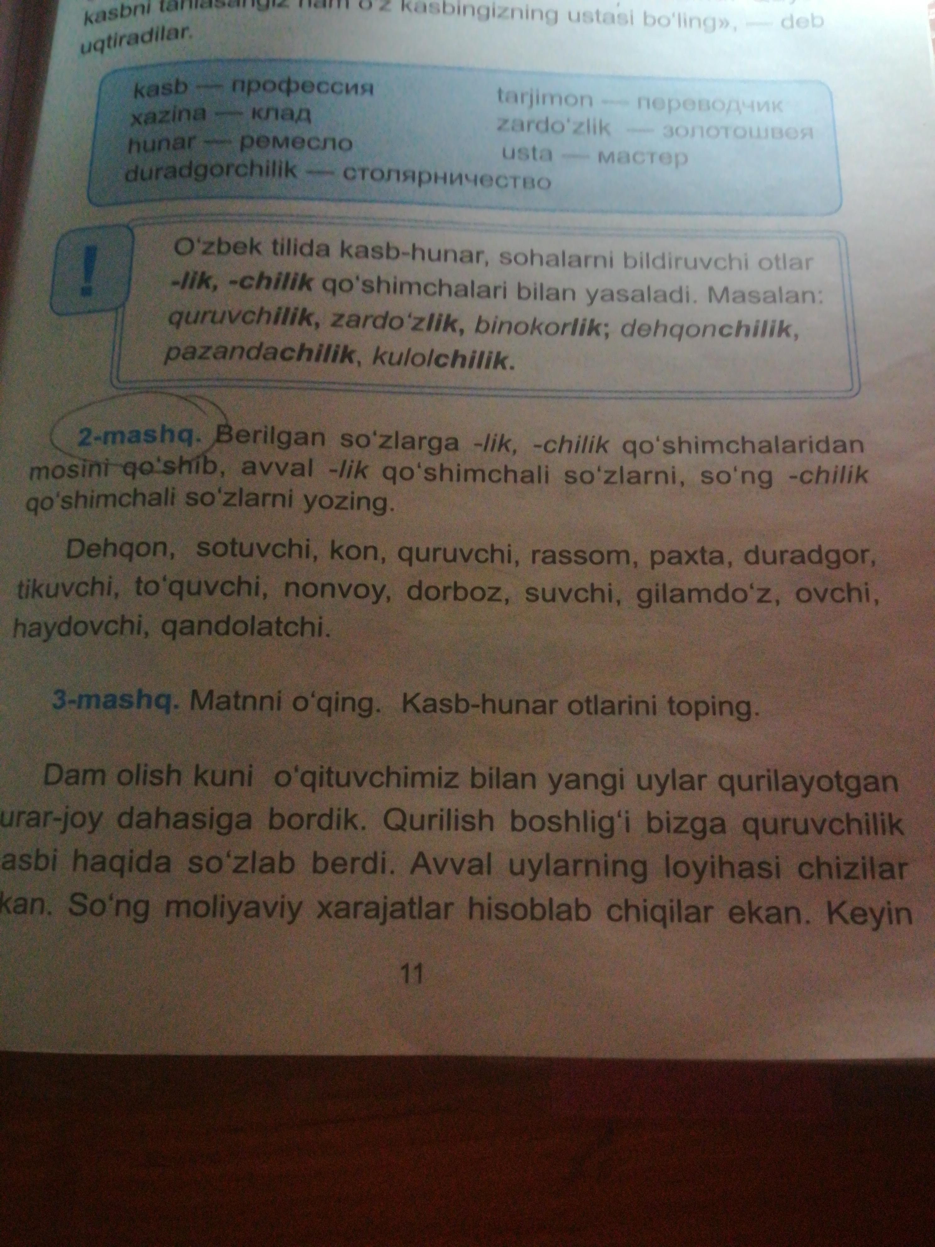 1) -lik. Sotuvchilik,quruvchilik,tikuvchilik,tõquvchilik,dorbozlik,suvchilik,gilamdõzlik,ovchilik,haydovchilik, qandolatchilik, nonvoylik,duradgorlik,