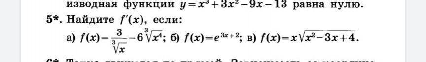 a)f(x)=\frac{3}{\sqrt[3]{x} }-6\sqrt[3]{x^4}=3x^{-\frac{1}{3}}-6x^{\frac{4}{3}}\\    \\f'(x)=3*(-\frac{1}{3})x^{-\frac{4}{3}}-6*\frac{4}{3}x^{\frac{1}{3} }=-\frac{1}{\sqrt[3]{x^4} }-8\sqrt[3]{x} \\    \\b)f(x)=e^{3x+2}\\\\f'(x)=e^{3x+2}*(3x+2)'=e^{3x+2}*3=3e^{3x+2}\\\\c)f(x)=x\sqrt{x^2-3x+4}=\\  \\f'(x)=1*\sqrt{x^2-3x+4}+x*\frac{1}{2}(x^2-3x+4)^{-\frac{1}{2}}*(2x-3)=\sqrt{x^2-3x+4}+\frac{x(2x-3)}{2\sqrt{x^2-3x+4}}