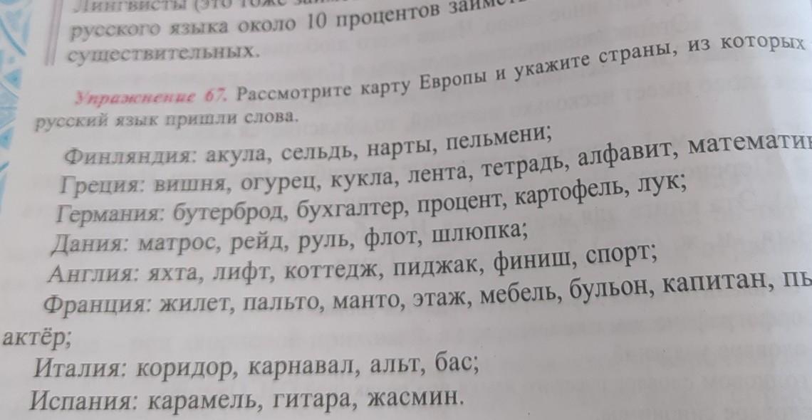 Рассмотрите карту Европы и укажите страны, из которых в русский язык пришли слова.