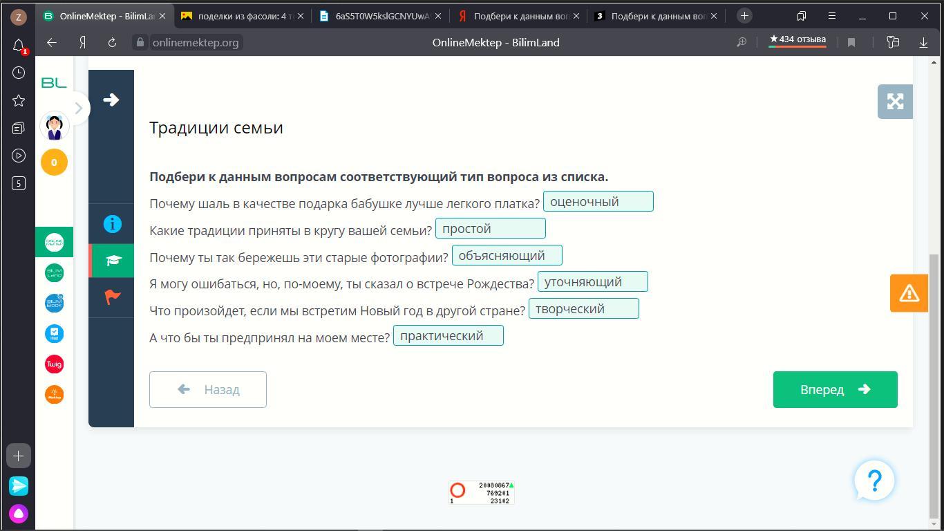 Подбери к данным вопросам соответствующий тип вопроса из списка