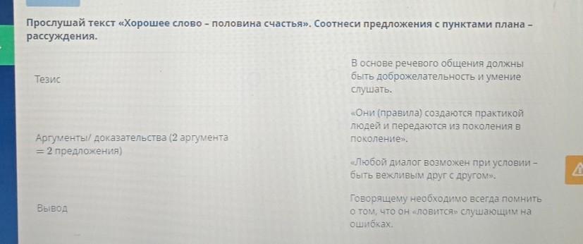 Прослушай текст «Хорошее слово – половина счастья». Соотнеси предложения с пунктами плана -