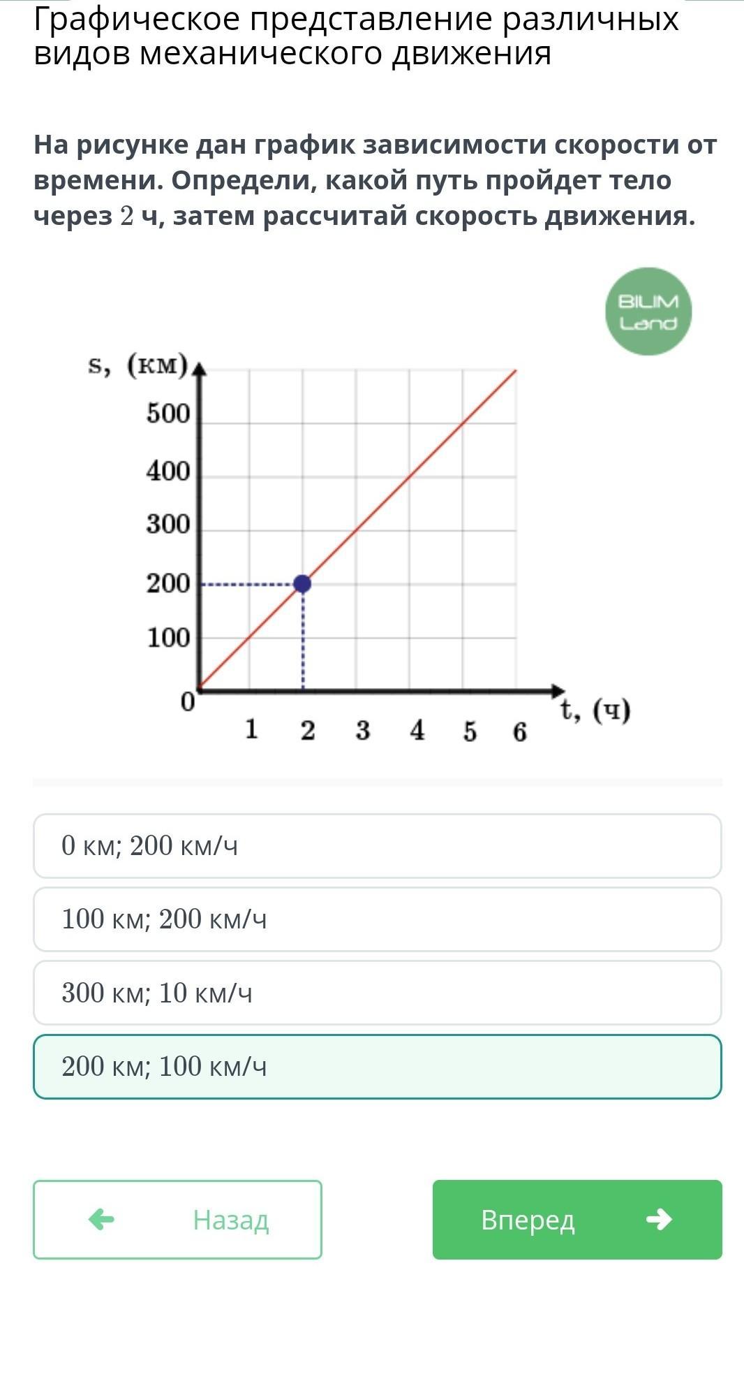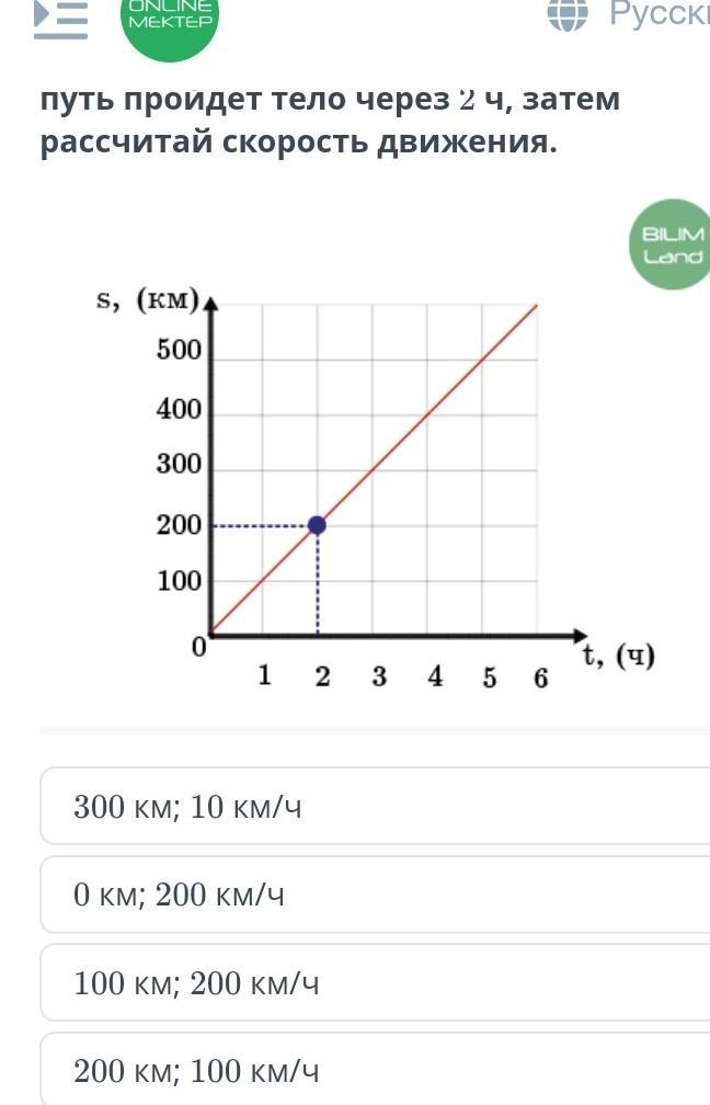 рисунке дан график зависимости скорости от времени. Определи, какой путь пройдет тело через 2 ч, затем рассчитай скорость движения.
