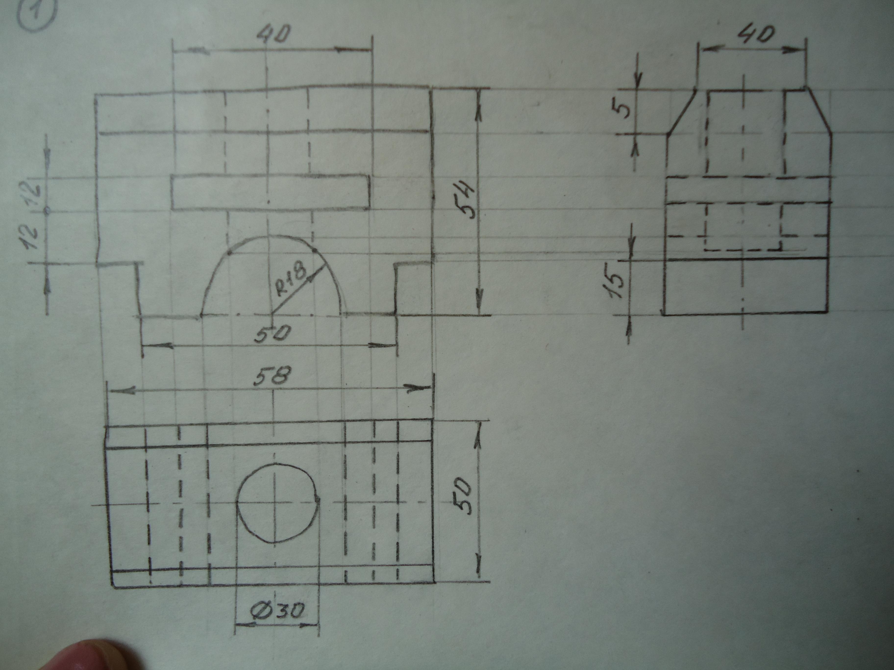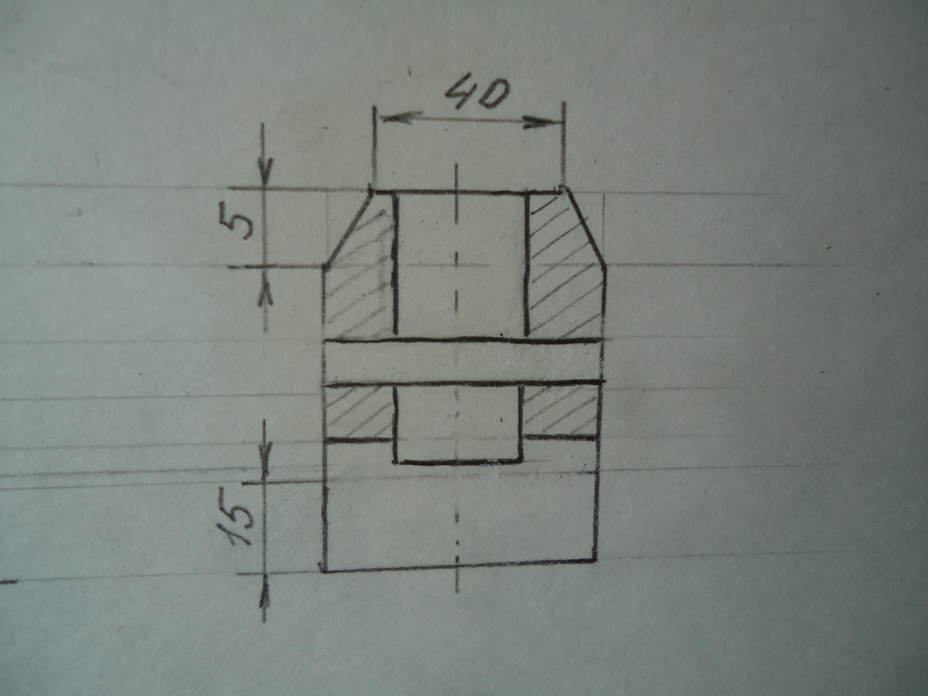 На втором фото показан вид слева после выполнения разреза. Горизонтальную линию внизу необходимо будет стереть, а все штриховые линии заменить на сплошные основные и дать штриховку сечения.