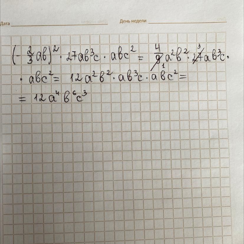 (-2/3ab)^2*27ab^3c*abc^2=4/9a^2b^2*27ab^3c*abc^2=12a^4b^6c^3