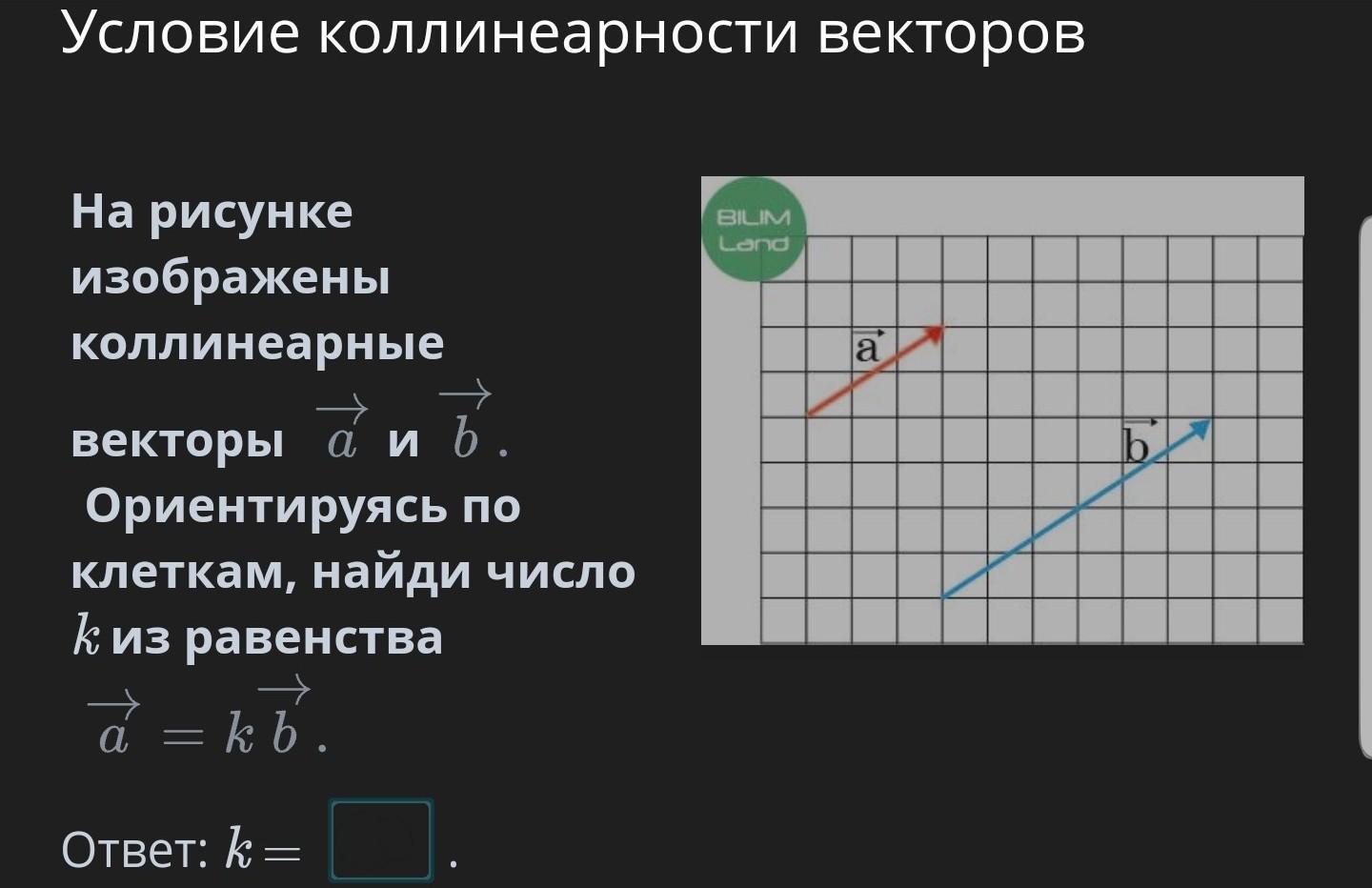 На рисунке изображены коллинеарные векторы a и b. Ориентируясь по клеткам, найди число k из равенства a = kb.