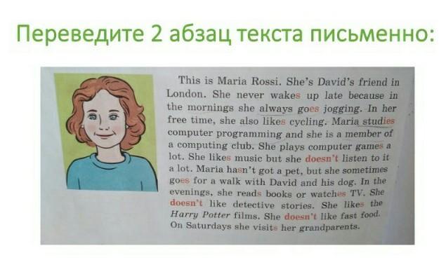 Это Мария Росси. Она подруга Дэвида в Лондоне. Она никогда не просыпается рано, потому что утром она всегда бегает. В свободное время она также любит езду на велосипеде. Мария учится программированию и она член компьютерного клуба. Она очень любит играть в компьютерные игры. Она любит музыку, но не слушает ее часто. У Марии нет питомца, но иногда она ходит на прогулку с Дэвидом и его собакой. Вечером она читает книги или смотрит телевизор. Она не любит детективные истории. Она любит фильмы про Гарри Поттера. Она не любит фастфуд. По воскресеньям она навещает своих бабушку и дедушку.
