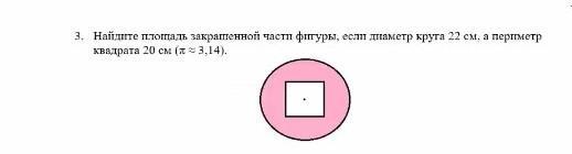 Найдите диаметр закрашеной фигуры если диаметр круга 22 см, а периметр квадрата 20 см