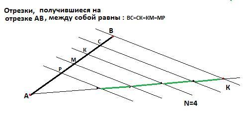 На луче АК отложите N равных отрезков. Через точку В и последнюю точку на луче проведите прямую. Через концы отрезков, отложенных на луче АК, проведите прямые, параллельные первой прямой. Сравните отрезки, получившиеся на отрезке АВ