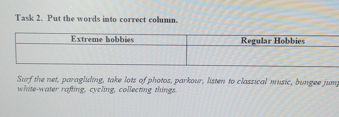 Extreme: paragliding, parkour, bungee jumping, white-water rafting, cycling.