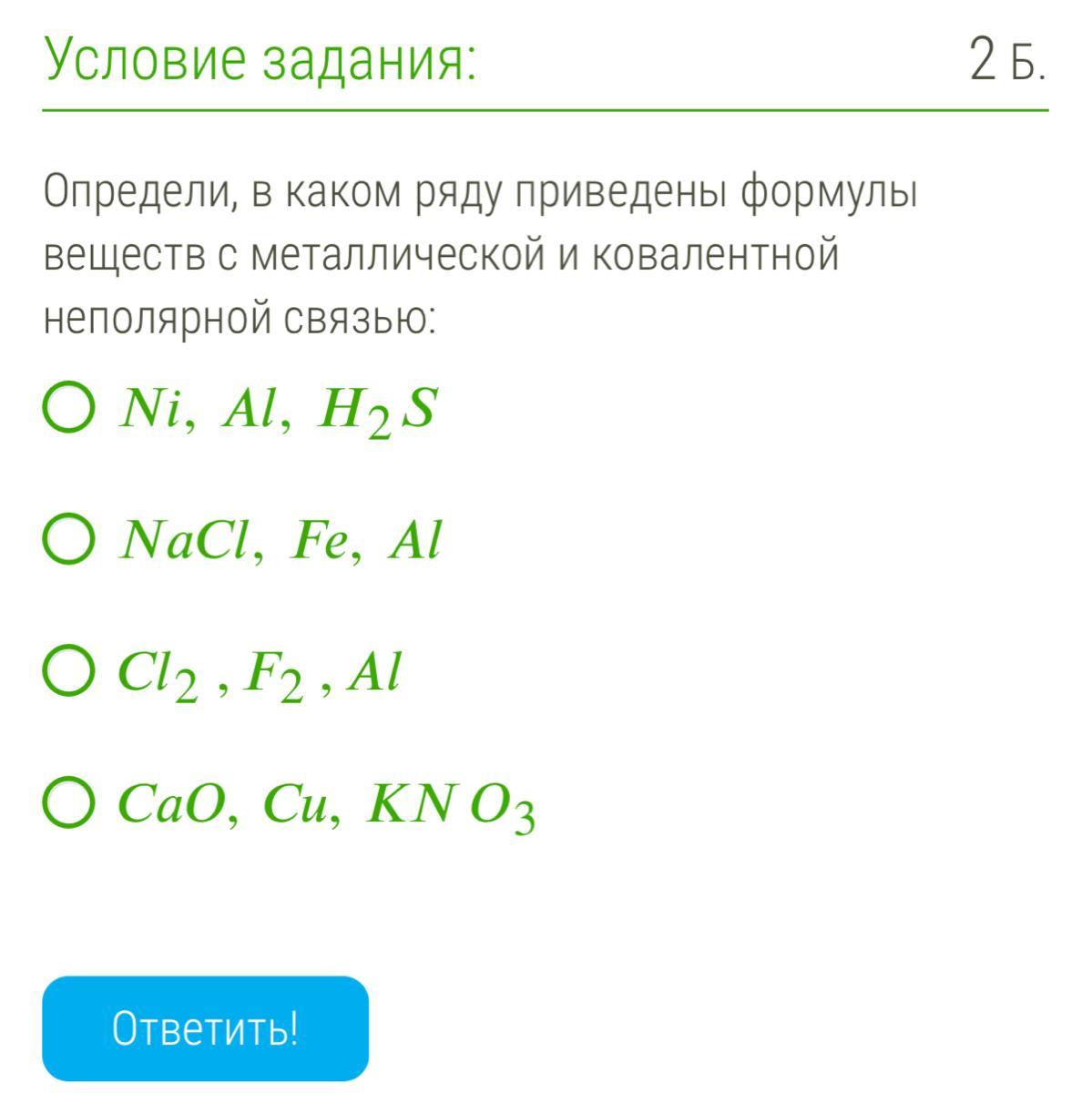 Определи, в каком ряду приведены формулы веществ с металлической и ковалентной неполярной связью: