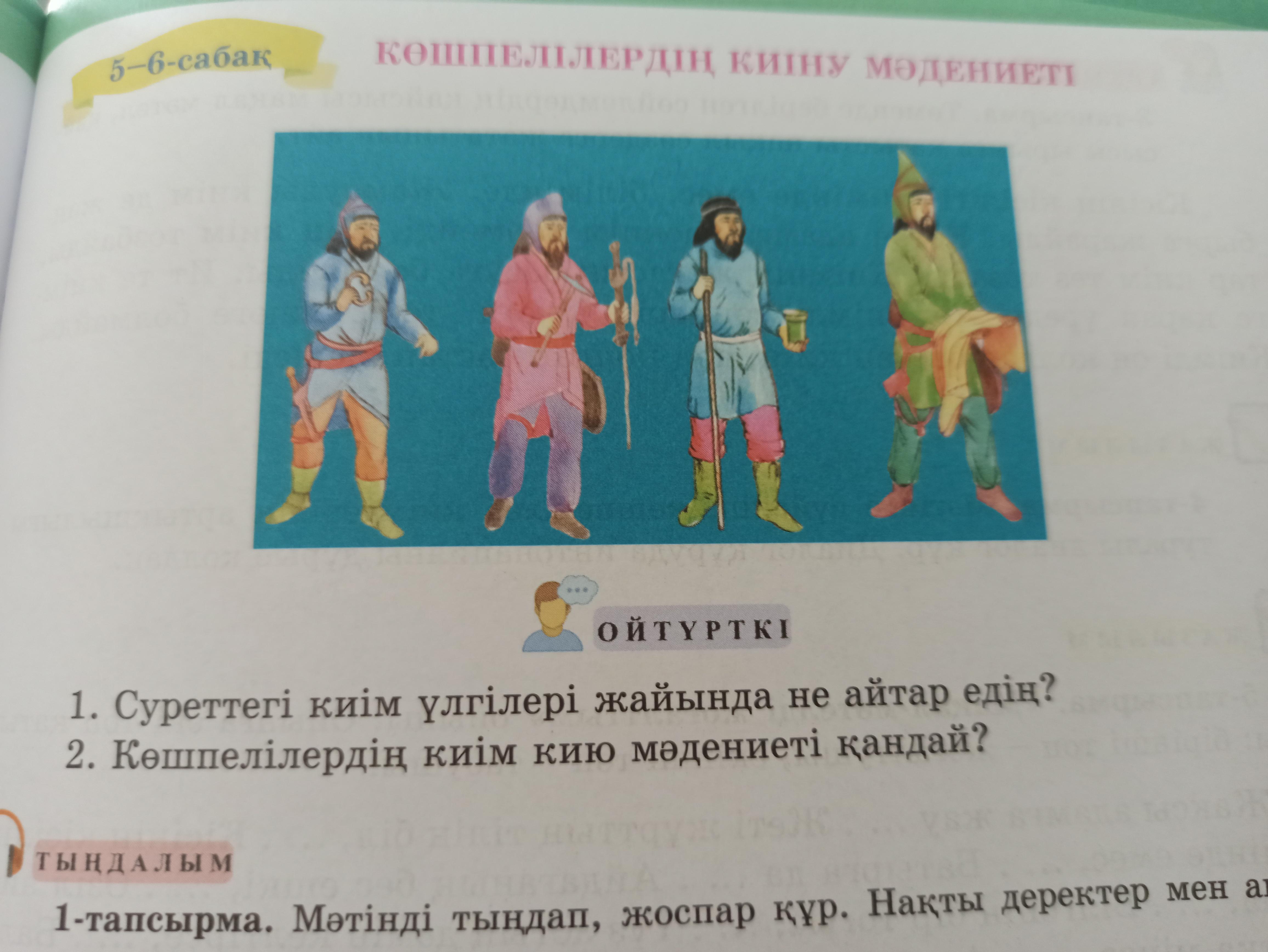 1 киім жауынгердіңкиімі секілді 2 ші киім аңшының киімі 3 ші киім көне тайпаның киімі4 ші киім уәзіряғни кеңесшінің киімі