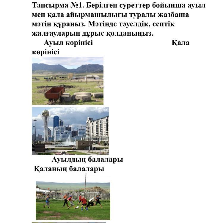 Ответ:ауыл көрінісі: ауыл кішкентай, бәрі бір бірін таниды, мал шаруашылығымен айналысады, жасыл жайлау бар.