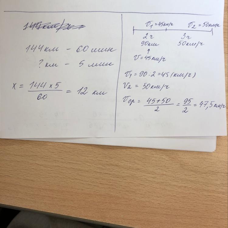 Задача 1. Поезд движется со скоростью 144 км/ч. Какой путь он пройдет за 5 мин? Задание 2 Автобус за первые 2 часа проехал 90 км, а следующие 3 часа двигался со скоростью 50 км/ч. Какова средняя скорость движения автобуса на всем пути?