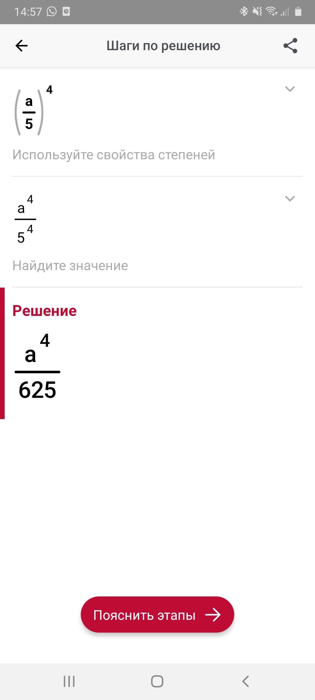 Ответ:а) 4¹¹×4-⁹=4²=16 б)х¹⁴:х⁹=х⁵ в)(а⁷)²= х¹⁴ г) (ах)⁶=а⁶х⁶ д) (а/5)⁴=на фото