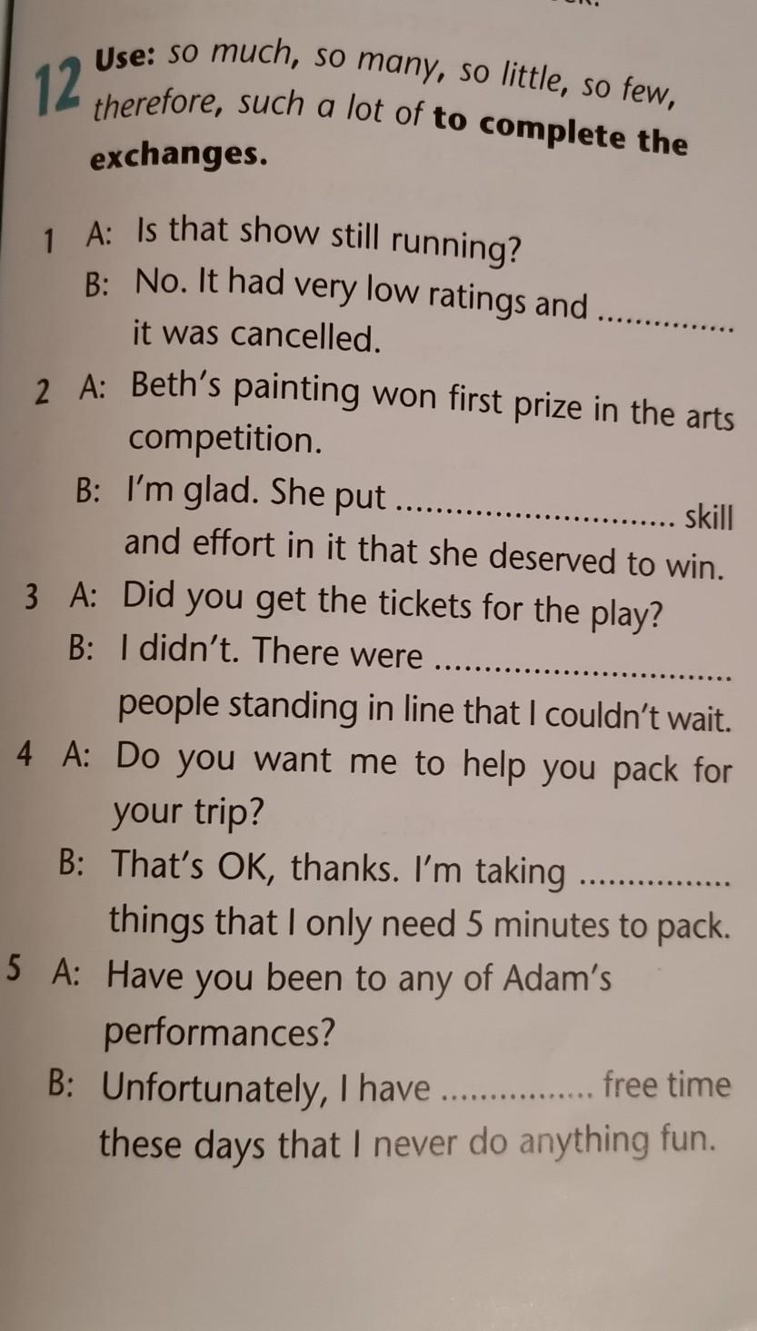 Use: so much, so many, so little, so few, therefore, such a lot of to complete the exchanges