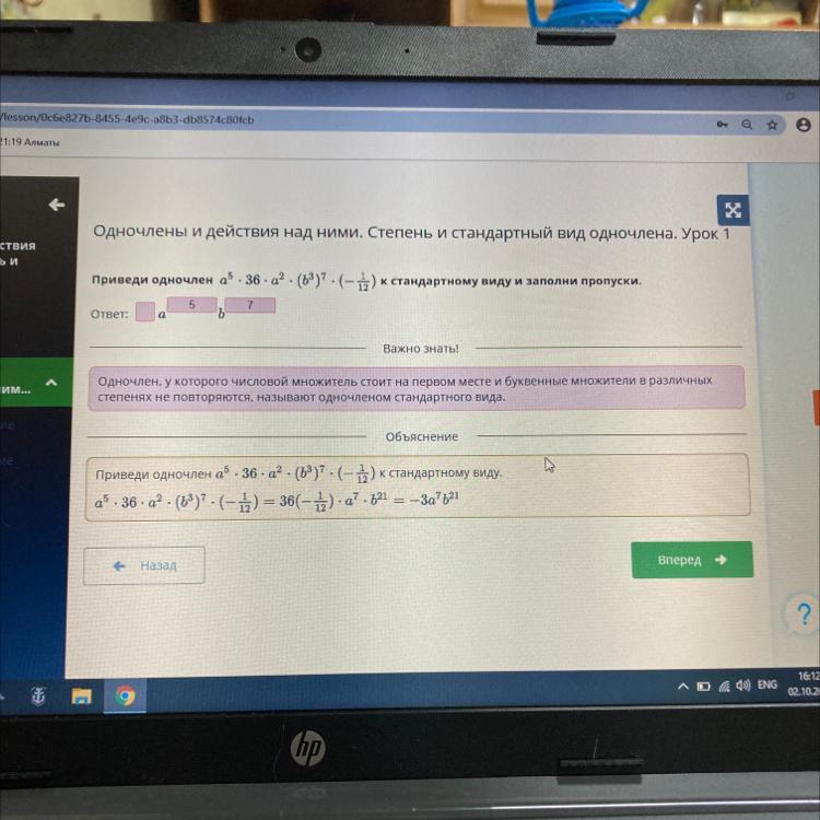 Переведи одночлен а5*36*а2*(b3)7*(-1/12) к стандартному виду и заполни пропуски,внизу фото ответ