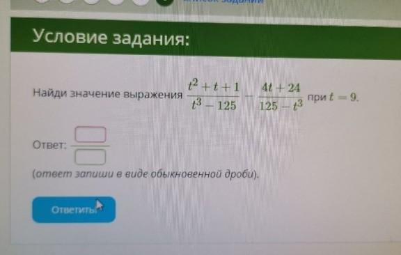 t^2+t+1/ t^3-125 + 4t+24 / t^3-125 (мы меняем минус на плюс так как во второй части уравнения мы 125-t^3 умножаем на -1)=( t^2+ t+1+4t+24 / (t-5)(t^2+5t+25) = t^2+5t+25/ (t-5)(t^2+5t+25)= 1 / t-5 =1 / 9-5=1/4