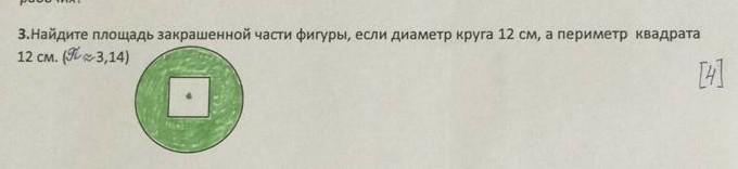 Найдите площадь закрашенной части фигуры, если диаметр круга 12 см, а периметр квадрата 12 см.