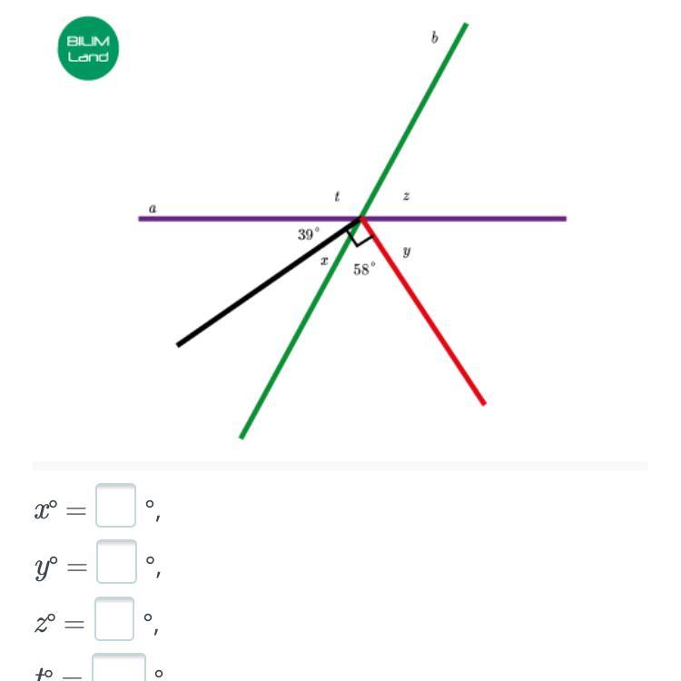 X+58=90 X=90-58=32. Угол 39+Х=уголZ,так как они вертикальные, значит z=39+32=71. t+z=180, так как они смежные и их сумма равна 180, найдем t=180-71=109. Угол у+58=t=109,как вертикальные, поэтому у=109-58=51