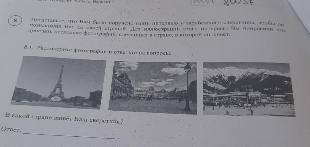 На первом фото изображена Эйфелева башня, на втором Лувр, на третьем Альпы (горнолыжный курорт).Из этого следует, что Ваш сверстник живёт во Франции (столица Париж).