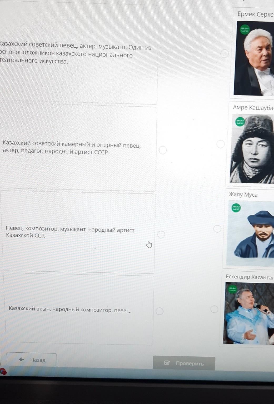 Рассмотрите портреты и соотнеси их с информацей о выдающихся личностях музыкальной культуры Казахстана