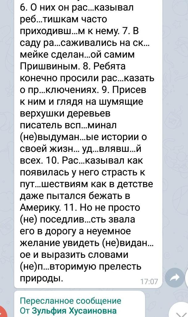 О них он рассказывал ребятишкам часто приходившим к нему.В саду рассаживались на скамейке сделанной самим Пришвиным.Ребята конечно просили рассказать о приключениях.Присев к ними глядя на шумящие верхушки деревьев писатель вспоминал не выдуманные истории о своей жизни удивлявшей всех